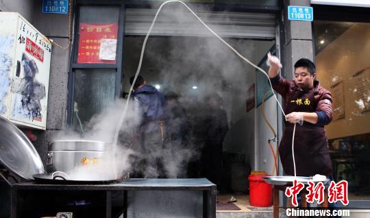 重庆一小面馆师傅上演绝活,一根面条50米,一碗面只有一根面。这家“一根面”面馆位于南岸区,只见面馆师傅赵明曦,将面条向天空抛去,面条在空中划出起伏的弧线,最高离地约两三米,最后面条稳稳落入沸腾的大锅灶内。两分钟后,将面捞起,热辣鲜香,劲道十足。 刘渝 摄